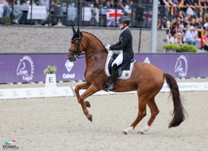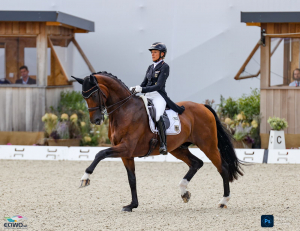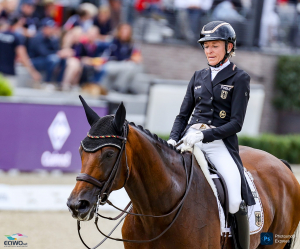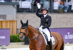 “Man hat immer kleine ‘Abers’, die noch besser hätten klappen können”, strahlt Katharina Hemmer, “dazu gehörte heute das Rückwärtsrichten, aber ich bin total happy. Denoix war super fokussiert, hatte tolle Highlights, ich hatte ein super Reitgefühl und ich bin richtig froh, dass wir unsere Championatspremiere heute so gut hinbekommen haben.”Und Denoix: “Er stand gleich nach der Prüfung mit Ohren vorne da, völlig ruhig und entspannt. Er wusste, dass er das gerade sehr gut gemacht hat”, schmunzelt Katharina. Mit 75,699 Prozent lieferten die Beiden das beste Tagesergebnis ab!