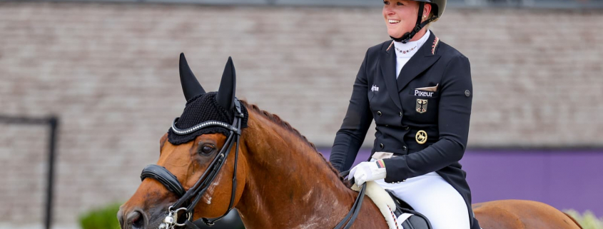 “Man hat immer kleine ‘Abers’, die noch besser hätten klappen können”, strahlt Katharina Hemmer, “dazu gehörte heute das Rückwärtsrichten, aber ich bin total happy. Denoix war super fokussiert, hatte tolle Highlights, ich hatte ein super Reitgefühl und ich bin richtig froh, dass wir unsere Championatspremiere heute so gut hinbekommen haben.”Und Denoix: “Er stand gleich nach der Prüfung mit Ohren vorne da, völlig ruhig und entspannt. Er wusste, dass er das gerade sehr gut gemacht hat”, schmunzelt Katharina. Mit 75,699 Prozent lieferten die Beiden das beste Tagesergebnis ab!