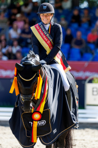Als viertplatzierter der Qualifikationsprüfung war Lodovico, der aus der Zucht der Wieghaus-Vorwerk GbR kommt und im Besitz des Gestüt Schafhof steht, ins Finale gekommen. Übrigens die einzige nicht goldene Schleife für den Rapphengst: „Ich habe ihn vor den Bundeschampionaten sechs Prüfungen geritten und er hat alle sechs gewonnen. Und er wurde von Prüfung zu Prüfung besser. Tatsächlich sind wir ohne Erwartungen nach Warendorf gekommen, ich bin einfach dankbar für dieses Pferd. Der Start hier war so oder so das I-Tüpfelchen auf diese Saison“, schwärmt Lena Haßmann von Lodovico. Im Finale überzeugte er erneut die Richter vor allem in Trab und Gesamteindruck: Trab 9,0, Schritt 8,4, Galopp 8,8, Durchlässigkeit 8,8 und Gesamteindruck 9,0. „Ein Trabablauf wie ein Metronom, unglaublich aktiv, immer gleichmäßig, immer vom Boden. Egal in welchem Tempo“, kommentierte Dressurrichterin Nicole Nockemann. Außerdem gefiel: „…der Schritt gelassen und souverän. Der Galopp war ähnlich wie der Trab sehr rhythmisch mit einem gut herangeschlossenen Hinterbein. In der Durchlässigkeit zeigt sich die gute Qualität, das gute Geritten sein und sehr viel Leichtigkeit.“