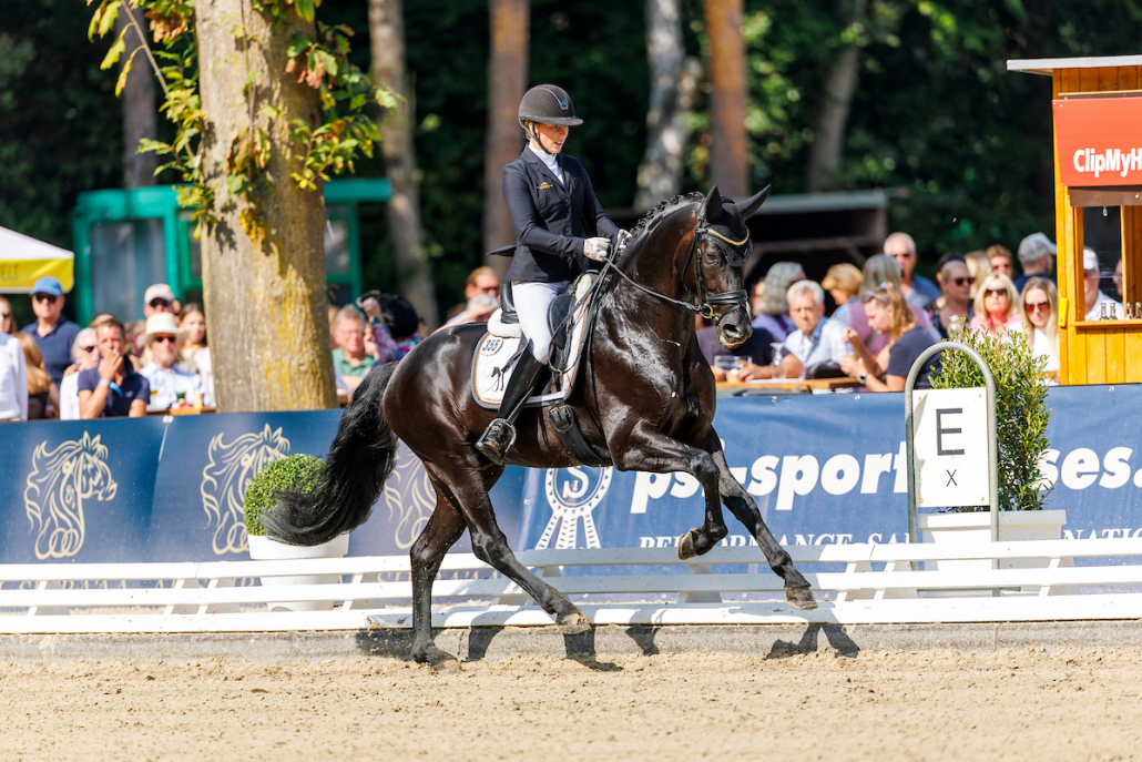 Als viertplatzierter der Qualifikationsprüfung war Lodovico, der aus der Zucht der Wieghaus-Vorwerk GbR kommt und im Besitz des Gestüt Schafhof steht, ins Finale gekommen. Übrigens die einzige nicht goldene Schleife für den Rapphengst: „Ich habe ihn vor den Bundeschampionaten sechs Prüfungen geritten und er hat alle sechs gewonnen. Und er wurde von Prüfung zu Prüfung besser. Tatsächlich sind wir ohne Erwartungen nach Warendorf gekommen, ich bin einfach dankbar für dieses Pferd. Der Start hier war so oder so das I-Tüpfelchen auf diese Saison“, schwärmt Lena Haßmann von Lodovico. Im Finale überzeugte er erneut die Richter vor allem in Trab und Gesamteindruck: Trab 9,0, Schritt 8,4, Galopp 8,8, Durchlässigkeit 8,8 und Gesamteindruck 9,0. „Ein Trabablauf wie ein Metronom, unglaublich aktiv, immer gleichmäßig, immer vom Boden. Egal in welchem Tempo“, kommentierte Dressurrichterin Nicole Nockemann. Außerdem gefiel: „…der Schritt gelassen und souverän. Der Galopp war ähnlich wie der Trab sehr rhythmisch mit einem gut herangeschlossenen Hinterbein. In der Durchlässigkeit zeigt sich die gute Qualität, das gute Geritten sein und sehr viel Leichtigkeit.“