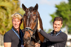 Frederic Wandres mit Blick auf seinen Nationenpreisstart in Fontainebleau: „Der Plan mit Bluetooth, in Fontainebleau zu reiten, steht tatsächlich schon seit Frankfurt. Und als jetzt meine Teamkollegen feststanden, war ich natürlich sehr happy: Isabell, Benni, Svenja – ich glaube, das ist ein tolles Team und das wird eine gute Zeit. Bluetooth ist sehr routiniert und ich kann mich auf ihn verlassen, auch nach der Pause, was die Atmosphäre oder ‚das Guckige‘ angeht, trotzdem muss jede Aufgabe wieder neu geritten werden. Man darf nichts dem Zufall überlassen und darf sich nie zu sicher sein. Wir haben über den Winter bis Ende März locker, aber regelmäßig trainiert. Wenn ich in Wellington war, hat ihn ein Kollege von mir ein bisschen gejoggt, und wenn ich da war, kam Monica (Theodorescu) regelmäßig und wir haben zusammen trainiert. Anfang April haben wir das Training ein bisschen mehr wieder Richtung Turnier ausgerichtet. Natürlich liegt der Schwerpunkt mit Blick auf die WM in Aachen. Und so ist auch über den Winter das Hauptaugenmerk gewesen: Bluetooth fit und fröhlich zu halten. Die Lektionen kann er, natürlich gibt es immer kleine Stellschrauben, aber da gab es jetzt nichts Konkretes, an dem wir ganz gezielt gearbeitet hätten. Morgen, Donnerstag, früh fahren wir los, machen auf der Hälfte in Aachen einen kleinen Stopp und dann geht’s weiter nach Fontainebleau.“
