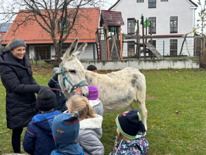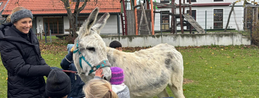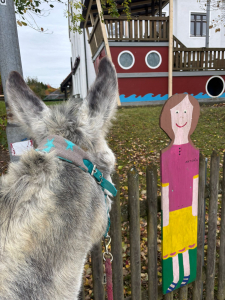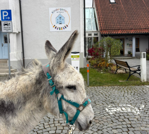 „Wir sind erstmal eine halbe Stunde zum Kindergarten Mittbach gelaufen, Fenja und ich, das hat super geklappt und dort wurden wir von 28 Kindern begrüßt“, freut sich Victoria Nielsen. Fenja ist ihre weiß-graue Eselstute, 27 Jahren jung und gehört zur Familie auf dem Pferdezentrum Daxau.