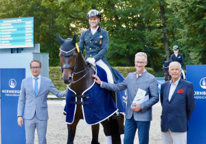 Dr. Christine Feichtinger hat den Dunkelfuchs aus einer Vivaldi-Mutter gezogen, ist auch weiterhin Besitzerin des Siegers. Dreijährig hatte Bon Courage bei den Bundeschampionaten bereits mit dem Vizetitel auf sich aufmerksam gemacht, damals noch unter dem Sattel von Jessica Lynn Thomas. Anfang siebenjährig hat ihn der selbstständige Dressurausbilder aus Neuenkirchen, Thomas Schulze, übernommen. Die Saison ging für das Paar steil bergauf. Schon Ende Juli in Elmlohe ist das Paar bei der Burg-Pokal-Etappe an den Start gegangen, hat aber die Finalqualifikation für die besten Zwölf nicht erreicht. Mitte August sind sie bis Görlitz gereist und wurden dort Siebte mit 69,073 Prozent, jetzt der Sieg in Darmstadt mit satten 5,27 Prozentpunkten mehr. „Unser Ziel war eine gute Platzierung“, erklärt Schulze, „aber dass das so klappt…