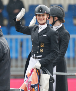 Seit knapp acht Wochen hat die viermalige Olympiasiegerin den zehnjährigen Dancier-Sohn Diallo im Stall, ist in Hagen bei ihrem zweiten Turnier, das erste Mal international mit ihm am Start und hat Diallo heute durch den ersten Special gesteuert. Das Ergebnis: 72,447 Prozent und der Sieg. Schon nach dem Grand Prix gestern hatte Jessica von Bredow-Werndl von einem ‘abnormalen Gefühl’ geschwärmt, das Ziel für den Special war klar: weniger Fehler. Das ist gelungen! Das Paar zeigte eine technisch fehlerfreie Runde, aber trotzdem noch mit Luft nach oben. Das Angaloppieren in X war noch etwas ungestüm im Vorwärts, die Piaffen noch nicht sicher auf der Stelle, die Wechseltouren noch etwas eilig. Hier und da fehlt dem Youngster natürlich noch die Routine und gelassene in Ruhe, insgesamt macht das Paar große Freude mit Blick in die Zukunft. “Ich bin sehr stolz auf Diallo und unsere Entwicklung in so kurzer Zeit”, erzählt von Bredow-Werndl. “Er war schon sehr gut ausgebildet. Jetzt hat er sich aber wirklich schnell auf mich eingelassen und es hat ziemlich schnell gefunkt zwischen uns beiden. Ich bin einfach neugierig wie weit wir uns die nächsten Wochen, Monate, Jahre noch entwickeln dürfen und bin sehr dankbar, so ein tolles Pferd reiten zu dürfen.”