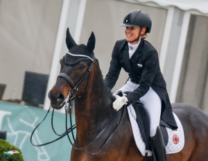 Seit knapp acht Wochen hat die viermalige Olympiasiegerin den zehnjährigen Dancier-Sohn Diallo im Stall, ist in Hagen bei ihrem zweiten Turnier, das erste Mal international mit ihm am Start und hat Diallo heute durch den ersten Special gesteuert. Das Ergebnis: 72,447 Prozent und der Sieg. Schon nach dem Grand Prix gestern hatte Jessica von Bredow-Werndl von einem ‘abnormalen Gefühl’ geschwärmt, das Ziel für den Special war klar: weniger Fehler. Das ist gelungen! Das Paar zeigte eine technisch fehlerfreie Runde, aber trotzdem noch mit Luft nach oben. Das Angaloppieren in X war noch etwas ungestüm im Vorwärts, die Piaffen noch nicht sicher auf der Stelle, die Wechseltouren noch etwas eilig. Hier und da fehlt dem Youngster natürlich noch die Routine und gelassene in Ruhe, insgesamt macht das Paar große Freude mit Blick in die Zukunft. “Ich bin sehr stolz auf Diallo und unsere Entwicklung in so kurzer Zeit”, erzählt von Bredow-Werndl. “Er war schon sehr gut ausgebildet. Jetzt hat er sich aber wirklich schnell auf mich eingelassen und es hat ziemlich schnell gefunkt zwischen uns beiden. Ich bin einfach neugierig wie weit wir uns die nächsten Wochen, Monate, Jahre noch entwickeln dürfen und bin sehr dankbar, so ein tolles Pferd reiten zu dürfen.”