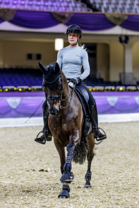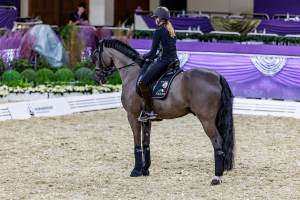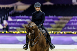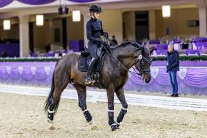 „Das erste Mal heute mit Zuperman in der großen Halle heute war wirklich gut, er war relativ entspannt. Aber es sind natürlich auch noch keine Zuschauer da und die Nikoläuse, die die Bahnpunkte halten, sind noch nicht angekommen. Wir gucken uns alles morgen früh noch mal in Ruhe an, aber der erste Eindruck war schon mal positiv. Ich bin zur Vorbereitung noch mal bei zwei Hallenturnieren mit ihm am Start gewesen, Oldenburg und Verden, und das hat ihm auch gutgetan. In Oldenburg war er noch ein bisschen ‚von der Rolle‘, Verden hat er dann schon sehr souverän gelöst. Er hat ein bisschen Platzangst und kann mit anderen Pferden auch schon mal hengstig sein, deswegen habe ich beim Training vorne im Schopf eine rote Schleife als Zeichen, dass die anderen Reiter möglichst ein bisschen Abstand halten.“