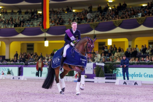 Mutter Weihegold OLD hat es vorgemacht, Sohnemann Special Gold PCH folgt ihrer Spur. 2014 hat Ausnahmestute Weihegold unter Beatrice Buchwald, inzwischen Hoffrogge, das Finale des Louisdor-Preises in Frankfurt gewonnen. Bei der letzten Etappe in Guxhagen hat sich Special Gold unter Katharina Hemmer nun auch das Finalticket gesichert. Es ist das dritte Pferd nach Signorina und Slaide, das Mannschafts-Europameisterin Hemmer für das Louisdor-Preis-Finale qualifiziert hat und sie schwärmt von ihrem Finalisten. 75,170 Prozent war ihr Endergebnis, das ist das zweitbeste in dieser Saison bei den Louisdor-Kandidaten. Ein Paar, das die Festhalle schon sehr gut kennt, hat sich mit Platz zwei das allerletzte Finalticket gesichert: der hessische Dressurprofi Thomas Wagner und Escolar’s Emil. Wagner war schon viele Male in der Festhalle am Start und hat 2012 das erste Louisdor-Finale in Frankfurt mit Very Keen gewonnen. Escolar’s Emil gehörte im vergangenen Jahr zu den Burg-Pokal-Finalisten, der Escolar-Sohn hat schon bewiesen, dass er mit der Festhalle im lilafarbenen Weihnachtsglanz wunderbar umgehen kann.