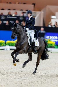 Raphael Netz hat großartiges Reiten zelebriert. Besser hätte man den 13-jährigen Dante Weltino-Sohn DSP Dieudonne (Z.: Anton Herre, Bes.: Sonja Krall) nicht präsentieren können.Die Trabtour aus einem Guss, in vertrauensvoller, stabiler Anlehnung und immer in der Balance. Kleine Bemerkung: In der Piaffe stimmt das Seitenbild samt Hankenbeugung, das tatsächliche Lastaufnehmen dürfen die beiden noch weiter verbessern. Absolutes Highlight: die Art und Weise sämtlicher Übergänge. Eine reelle, durch den Körper arbeitende Schritt-Tour ging in eine fehlerfreie Galopp-Tour über. Die Einerwechsel dürfen noch sicherer, ausbalancierter und gerader werden, insgesamt sollte Dieu noch mehr über den Rücken im Galopp springen, aber die Entwicklung, die dieses Pferd in den vergangenen Monaten gemacht hat, ist enorm. 2022 hat Netz den hocheleganten Rappen das erste Mal im Nürnberger Burg-Pokal vorgestellt, seitdem hat er ihn ausgebildet und wunderbar reifen lassen.