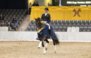 Wie in der Qualifikation sammelten der Bon Coeur/Vivaldi-Sohn Bon Courage (Z.+B.: Dr. Christine Feichtinger/LIE) und Thomas Schulze im Finale um den FRH-Cup die meisten Punkte. Vor sieben Jahren war der Dunkelfuchs an gleicher Stelle bei seiner Körung als Prämienhengst gefeiert worden und hatte dann eine Box auf dem Gestüt W.M. in Visselhövede bezogen. Mittlerweile steht er den Züchtern über das Dressurpferde Leistungszentrum Lodbergen zur Verfügung. „Bon Courage lebt jeden Tag für seinen Reiter und wirft sein Herz für mich ins Viereck“, schwärmt Thomas Schulze. Sein Ergebnis für eine sehr fein gerittene und harmonische Runde: 72,317 Prozent.