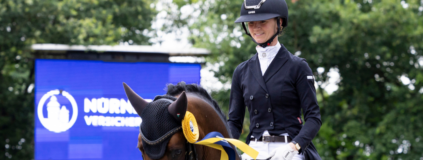 Greta Busacker hatte gleich zwei Gründe, sich zu freuen: über Platz drei mit der achtjährigen Frieda NRW v. For Dance und über den Gewinner des Stilpreises, der inzwischen nicht nur beim Finale, sondern bei jeder Burg-Pokal-Etappe vergeben wird. Zum zweiten Mal in dieser Saison, nach Balve nun auch in Elmlohe, nahm den die Tochter von Ingrid Klimke, Greta Busacker entgegen. Chefrichter Pascal Strohbücker hatte der 22-Jährigen die sagenhafte 10 für Sitz und Einwirkung gegeben. „Das habe ich noch nie erlebt“, gestand Greta fast sprachlos. „Das ist ein Tag, den ich nie vergessen werde!“ Platz fünf war es in Balve für Frieda und Greta, Platz drei in Elmlohe und in zwei Wochen haben die beiden die sechste Burg-Pokal-Etappe in Görlitz auf dem Plan. „Wir hoffen, dass wir den positiven Fluss weiter mitnehmen können und dann schauen wir mal weiter.“