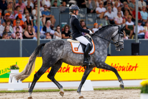 Die kommentierende Richterin Maria Colliander aus Finnland schwärmte: „Der Trab ist sehr aktiv, sehr elastisch, sehr gut in der Balance und mit gut schwingendem Rücken.“ Ausgedrückt in der Note wurde die richterliche Begeisterung mit einer 9,3. Auch von dem raumgreifenden Schritt und dem aktiven Bergauf-Galopp waren die Richter angetan und vergaben 8,3 bzw. 9,0 für den neuen Weltmeister. „Gleichmäßige Anlehnung, schwingender Rücken, gut dem Reiter zuhörend“, das waren die Stichworte der finnischen Kommentatorin für die Durchlässigkeit, die mit 9,2 bewertet wurde. Für die Perspektive erhielt der charmante Schimmel zudem eine 9,5. Mit dem Endergebnis von 90,60 Prozentpunkten war klar: Das ist die Goldmedaille.