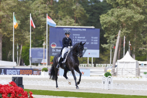 Sehr gut hat sich das Paar Dr. Svenja Kämper-Meyer und Amanyara M FRH an ihrem ersten Fünf-Sterne-Nationenpreis-Wochenende in Szene gesetzt. Schon im Grand Prix lieferten die beiden eine sehr harmonische und sichere Runde ab, auch im Special waren sie gut unterwegs – mit ein paar Eckchen. Ein kurzes Umspringen im versammelten Galopp und auch bei diesen beiden steckte heute der Teufel in den Einerwechseln. Insgesamt: ein super harmonisches Paar, das einfach Spaß macht! Platz vier mit 71,362 Prozent.