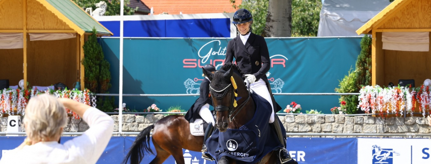 In Görlitz gab es noch einen ungewöhnlichen Preis hinzu: Eine Flasche Champagner für die 10 im Mittelgalopp, ausgelobt von Heiko Stransky. Diese Flasche nahm Siegerin Hoffrogge mit nach Hause. Zuperman flog in den Galoppverstärkungen geradezu durch das Görlitzer Viereck. „Die Dynamik, die dieses Pferd hat, ist unheimlich kraftvoll“, schwärmt die Reiterin und Besitzerin. „Er hat diesen Saft in sich und federt dabei vom Boden weg. Das ist ein unglaubliches Gefühl.“ Schon Ende April war das Paar in Hagen im Burg-Pokal am Start, seither sei er nicht nur kräftiger und insgesamt stabiler geworden, erzählt Hoffrogge. „Er ist auch noch lektionssicherer. Ich bin hier mit ihm in Görlitz eingeritten und es fühlte sich direkt so an, als ob er sagt: ‚Komm, lass uns das machen.‘“