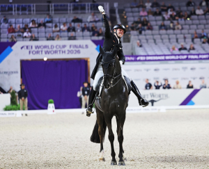 Moritz Treffinger und Fiderdance haben nach einem top Grand Prix auch eine super Kür präsentiert. Am Anfang noch mit etwas Übereifer unterwegs baute ‘Fidel’ noch einen Taktfehler im starken Trab und ein kurzes Angaloppieren in der Trabtour ein, aber der 22-Jährige Bonhomme-Bereiter ließ sich überhaupt nicht aus dem Konzept bringen, blieb ruhig und ritt ‘drüberweg’. Besonders die Rechtstraversale floss durch das Pferd, in den Pirouetten zelebrierte Moritz und die Verbindung Reiterhand-Pferdemaul war von konstanter Feinheit geprägt. Zu Beginn der Einerwechsel leistete sich das Paar einen nicht ganz durchgesprungenen Wechsel, was ein paar punkte kostete. Insgesamt: zwei sehr gut gerittene Prüfungen abgeliefert – Chapeau! Platz acht mit 77,360 Prozent bei seiner Weltcup-Final-Premiere, ein schöner Grund zum Feiern.